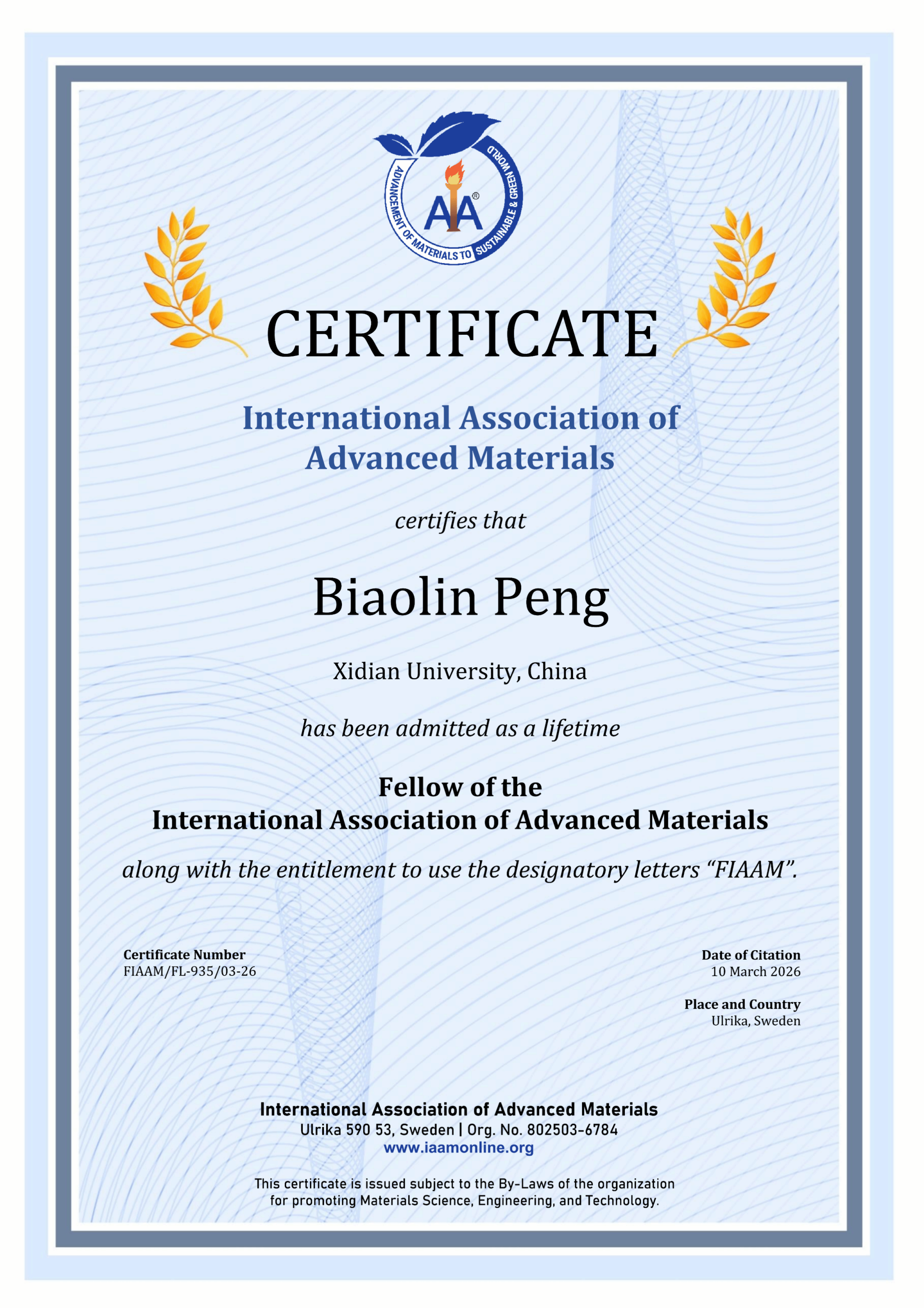 国际先进材料学会(IAAM)成立于2010年,总部位于瑞典斯德哥尔摩,是先进材料领域具有重要国际影响力的学术组织,致力于推动材料科学、工程与技术的创新发展,并搭建高水平国际学术交流平台。IAAM终身会士是该学会授予全球科学家的崇高荣誉,旨在表彰在材料科学、工程和技术领域作出原创性和重要贡献的杰出科研人员。该荣誉的遴选程序极为严格,需经过专家提名、学术委员会评审和学术演讲等多个环节,每年在每个学科仅评选不超过3名科学家。获此殊荣的学者被授权使用“FIAAM”荣誉称谓,以彰显其在材料科学领域的卓越地位。