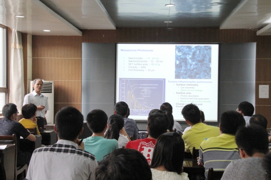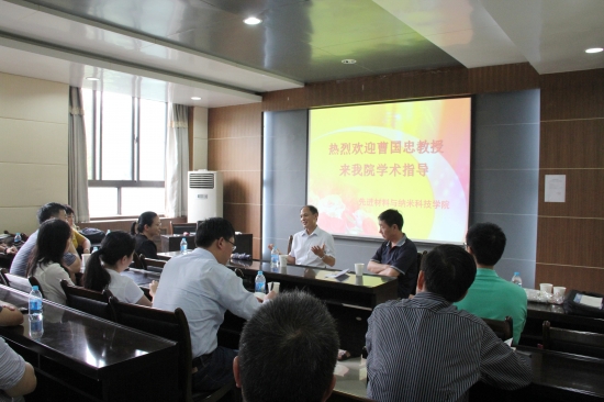 曹国忠教授介绍了其课题组在纳米材料应用于能源转换和存储领域的研究工作,重点从纳米结构光阳极在染料敏化与量子点敏化太阳能电池中的应用、纳米结构 电极在锂离子电池中的应用,以及多孔碳及其表面修饰在超级电容器中的应用等三个方面进行了介绍。永利3044集团官网50余名师生聆听了报告。报告会 后,曹国忠教授与学院教师进行了座谈交流。