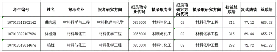 因学校指标调整,现给我院追加3个招生指标。根据《永利3044集团官网2023年硕士研究生招生复试工作方案》第八条第七款,“拟录取名单公示后,如上级部门追加名额,或者在公示期间考生因各种原因放弃待录取资格,学院可在剩余全体合格考生(不区分学科/领域)中按总成绩排名依次征求志愿拟录取,录取领域为材料与化工。被其他单位拟录取的考生,不具备被我院录取资格。”补录的三位同学录取专业为材料与化工,录取研究方向为材料化学工程。专业调整的考生须通过中国研招网调剂系统进行调剂录取(学院将开放调剂系统进行录取),专业未调整的考生直接拟录取。补录名单公示如下: