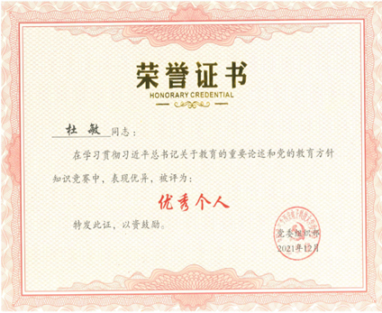 提升专业素养,增强业务本领。在注重和加强理论学习同时,杜敏通过学校党建“双创”专题培训班、工会干部培训、党建工作专题培训等各类培训,不断增强业务开展的系统性、全面性,做到了业务流程熟悉掌握、节点要求把握准确,从而在服务师生过程中展现出良好的专业素养和业务水平。此外,她还积极组织师生党员参与学校各类党建知识竞赛及活动,多次获得竞赛优秀个人、个人优秀奖等荣誉。2024年度民主评议党员中,杜敏更是得到了支部和党员的高度认可,获得“优秀”等次。