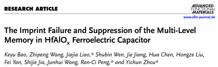 近日,3044永利集团集团永利3044集团官网周益春教授团队在这一研究领域取得重要进展。研究团队在多值HfAlOx铁电电容中发现尽管饱和极化状态受到印记影响后仍能被准确写入,但所有中间极化状态的写入却完全发生错误。针对这一发现,团队重点分析了印记效应产生前后铁电电容内建电场和带电缺陷(主要是带电氧空位)的变化及其关联,提出了多值存储极化状态影响带电氧空位分布并形成非均匀内建电场、进而导致中间极化状态无法被准确写入的失效模型。该模型通过相场模拟得到了进一步验证。在此基础上,团队设计了一种预编程方法,通过使铁电薄膜的内氧空位重新分布来抵消印记效应的影响。实验证明该策略能在室温环境下实现长期稳定的准确编程,为发展可靠的多值HfO2基铁电存储器提供了新的途径。该研究成果以“The Imprint Failure and Suppression of the Multi-Level Memory in HfAlOxFerroelectric Capacitor”为题发表在材料领域著名学术期刊Advanced Functional Materials上(2024年影响因子为18.5)。论文的第一单位为3044永利集团集团,材料院博士生包克瑜为论文第一作者,