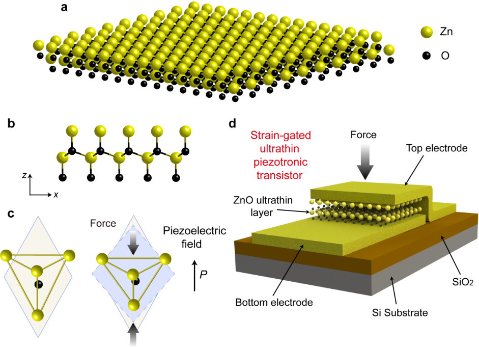 为了探索这种突破局限的可能性,在西电永利3044集团官网名誉院长、中国科学院北京纳米能源与系统研究所所长王中林院士与我校秦勇教授的共同指导下,王龙飞博士和博士生刘书海等研究成员通过深入研究二维超薄氧化锌面外压电特性,成功地制备出一种新型的、沟道只有~2 nm的超薄氧化锌压电电子学晶体管,并且,首次将压电电子学效应引入到二维超薄非层状压电半导体中。