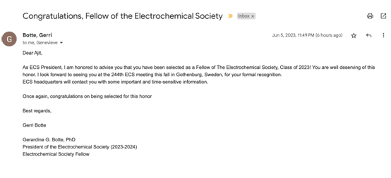 近日,3044永利集团集团永利3044集团官网Ajit Khosla教授当选2023届美国电化学会会士(Fellow of the Electrochemical Society, ECS),并受邀参加今年秋季在瑞典哥德堡召开的第244届美国电化学会会议(244th ECS Meeting)。