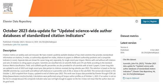 据了解,全球前2%顶尖科学家榜单是Elsevier与斯坦福大学John P. A. Ioannidis教授团队合作的项目成果,发布在Elsevier旗下的Mendeley Data网站上。榜单基于Scopus数据库的引用数据系统分析,以被引数(区分自引和他引,提供自引数据)、H指数、HM因子等6种综合指标 (composite score,C-score),根据 “生涯影响力”和“年度影响力”从近700 万名科学家中遴选出世界排名前2%的科学家,分为22个领域和176个细分子领域;为科学家长期科研表现提供了一个衡量指标,能够更客观、更真实地反映科学家的影响力。