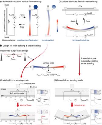 研究团队提出了一种创新的结构设计,将压电微米线与具有微突起结构的柔性聚合物相结合,设计了双模式压电电子学晶体管(dual-modal piezotronic transistor,简称DPT),使其同时具有两种工作模式,可分别用于高灵敏度的竖直力传感和横向应变传感。这是一个集成竖直力传感和横向应变传感两种结构优势的新设计方案,对开发压电电子学传感器的新原理和潜在应用具有重要意义。