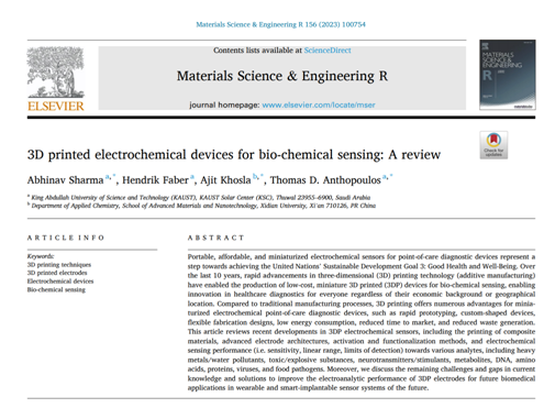 近日,3044永利集团集团永利3044集团官网Ajit Khosla教授在国际顶级期刊《Materials Science & Engineering R-reports》发表了题目为:3D printedelectrochemical devices for bio-chemical sensing: A review的论文,综述了3D打印电化学传感器的最新发展,并希望将其应用于未来生物医学领域的可穿戴和智能植入式传感器系统。