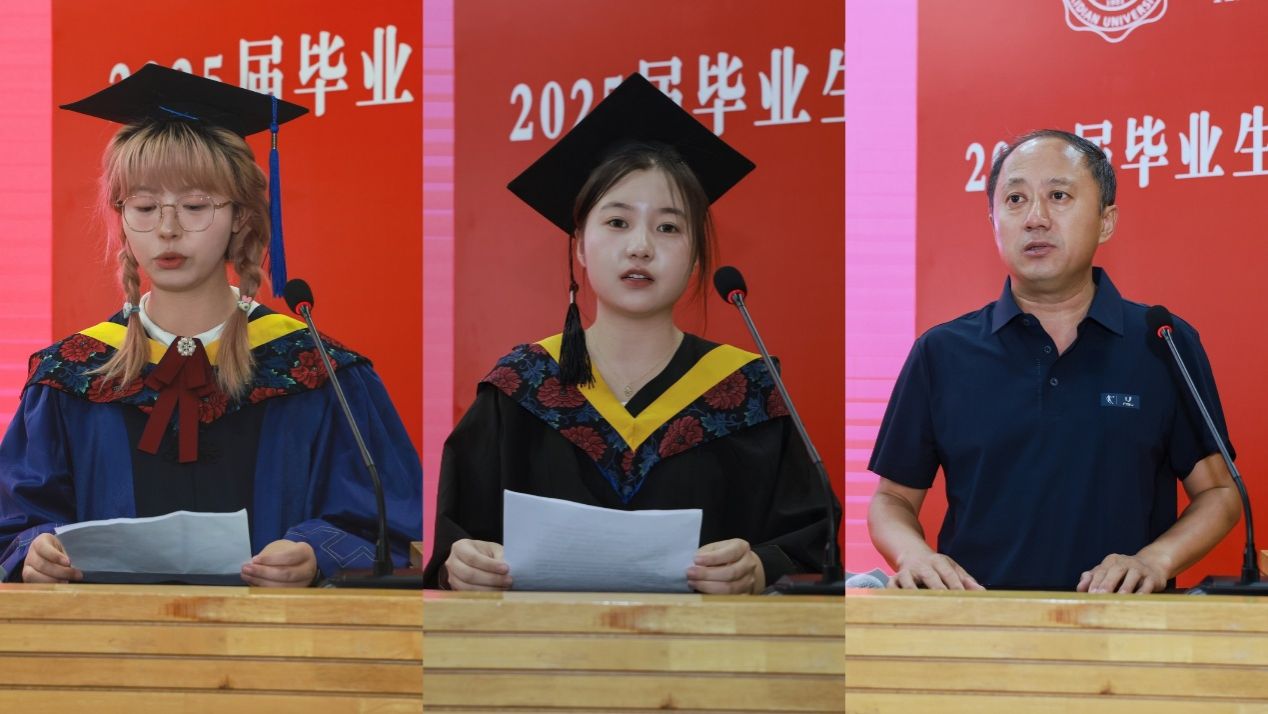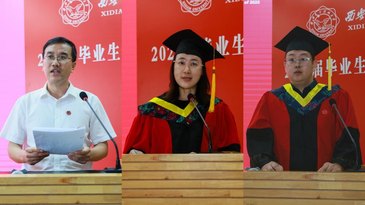 研究生代表谯云以实验室的晨光与论文录用的泪水串联三年求学时光,感恩学院以红色基因铸魂,以科研平台育才,承诺将带着西电精神奔赴科技报国战场。本科生代表朱志伟生动回忆樱花大道打卡、期末图书馆抢座的校园点滴,笑称“B楼迷宫终成青春坐标,并深情告白师长:您搭建的知识桥梁,是我们走向世界的底气。”