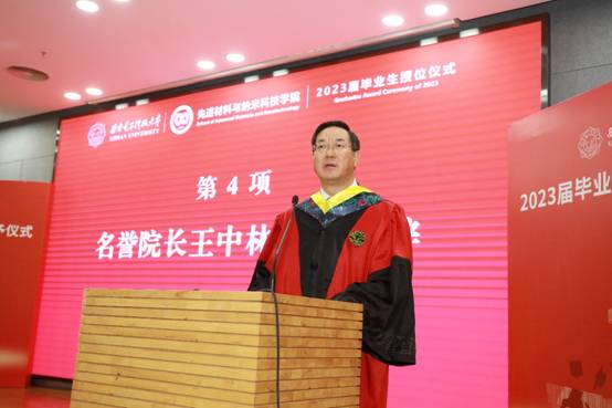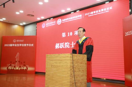 二是脚踏实地,矢志奋斗,方能鱼跃龙门成栋梁。曾经的你们,本就已是高考或考研大军中的佼佼者。今天的你们,更是领略了满腹经纶的智慧,展现了经世致用的才干,具备了艰苦奋进的意志,所以,我从不怀疑你们的实力,只期待你们脚踏实地,矢志奋斗,在电子材料的时代龙门上早日成为国家栋梁。我们的优秀校友、名誉院长王中林院士,即是你们奋进的榜样,也是你们前进的守护。因为这份守护,今天他特别来到这里,为你们见证和祝福。今天的你们,已有第七届全国“互联网+”金奖的张殊诚、国际数模竞赛特等奖提名的邱嘉俊和黄子凡,在先进能源材料领域顶刊AEM发表论文的叶涛、“毕业之星”武新明、优秀硕士论文叶涛、张建斌等。未来的你们,就如同初升的骄阳,会更辉煌。