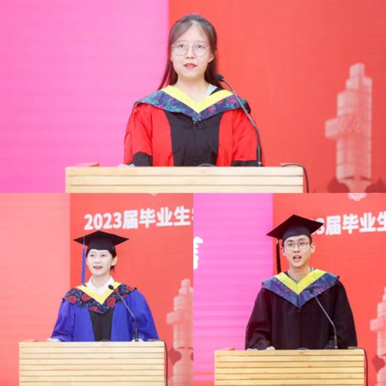 陕西省高层次青年人才谭丹副教授作为教师代表发言,她动情地说到:“文凭不等于水平,学历不等于能力,学以致用,才能在社会这所大学中获得认可。”她鼓励毕业生以开放的胸襟和积极的进取心拥抱新的挑战,不断学习,不断修炼,到达人生新高度。“积岁月之沉淀,谱未来之新篇”硕士毕业生代表刘心怡回顾了在西电的三年求学时光,她表示:无论走多远,“厚德、求真、励学、笃行”校训都永远深烙西电学子心中。本科生代表张殊诚分享了自己四年来的成长历程,抒发了自己毕业喜悦的心情,对于西电,他难掩留恋,他表示即便未来充满选择,前进之路荆棘丛生,但希望西电青年可以保持热爱,拥有一颗勇敢向前的心,归来仍是少年。