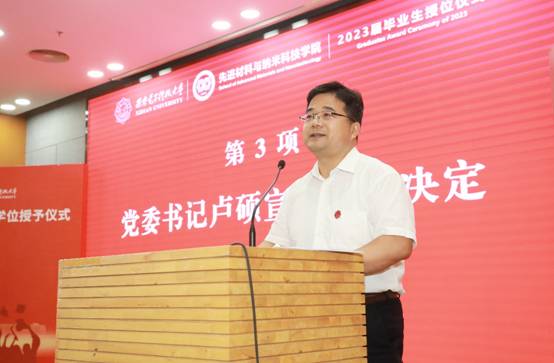 伴随着庄严的国歌声,学位授予仪式正式拉开帷幕。首先,学院党委书记卢硕宣读了学位授予决定。