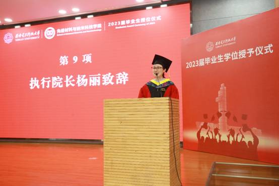 学院执行院长、国家级领军人才杨丽教授在致辞中回顾了学院近年来取得的可喜成绩:在世界顶级科学家——王中林院士和郝跃院士的战略引领下,学院汇聚了周益春教授等多位学术大家,拥有一批国家级、省部级人才梯队,师资力量雄厚,学科专业发展位处国家一流、ESI国际梯队,科研领域承接国家重大科研任务,担当陕西省空天高电子轨道材料与防护技术重点实验室建设重任。她代表学院,回顾了毕业生同学们四年的生活点滴,为毕业生们送上三句临别寄语:一是“践行初心,担当使命,方能行稳致远克万难”,希望同学们能践行初心,赓续传统;二是“脚踏实地,矢志奋斗,方能鱼跃龙门成栋梁”,希望同学们能发挥实干精神,积极进取;三是“砥砺前行,心怀梦想,方能拨云见日向朝霞”,希望同学们能始终保持对电子材料的热爱和追求。最后杨丽向全体毕业生送上祝福,希望他们在人生的道路上勇往直前,实现自己的梦想和目标;在追求卓越的道路上永不止步,为祖国的未来贡献智慧和力量,并真诚邀请同学们常回家看看。