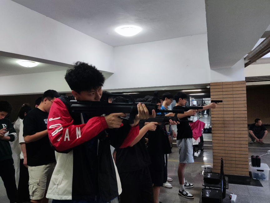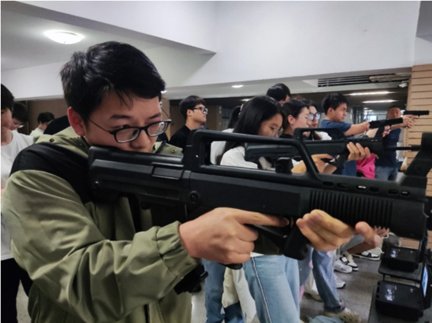 现场学生分成五组射击,十发实战,这是一场技术与细心的角逐,模拟枪声此起彼伏,场外更是传来阵阵惊呼,电子打靶系统实时反馈着同学们的射击成绩,每一次射击都是对同学们技艺的考验和心理素质的锻炼。在紧张刺激的氛围中,同学们不断提升自己的射击水平,也收获了满满的成就感和自豪感。