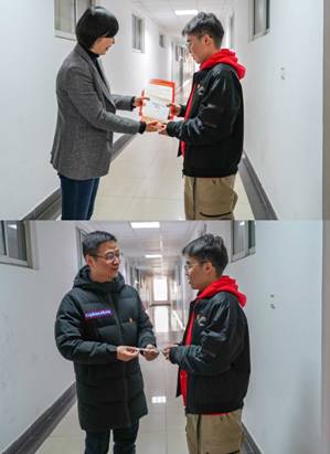 仪式伊始,李逸君向大家逐一介绍了李兰、邱嘉俊、武新明等11位预备党员同志的基本情况。接着,程远为同志们佩戴党徽、授牌,并语重心长地对他们说:“党员身份是荣誉,更是一份责任。希望你们今后初初争先进、实实做表率,带领身边同学走好当下,创造未来”。随后,党员同志们郑重地将承载着使命、责任与荣光的“党员宿舍牌”挂在了门上,并接受了吴微赠与的《中国共产党简史》、《致丁香一号书院全体学生党员的倡议书》。吴微满怀希冀地对大家说道:“祝贺你们在建党100周年光荣地成为了中国共产党党员,希望你们不忘初心、牢记使命,沿着先辈的红色道路继续奋斗,开辟新天地、书写新篇章。”最后,党员同志们与程远、吴微合影留念。