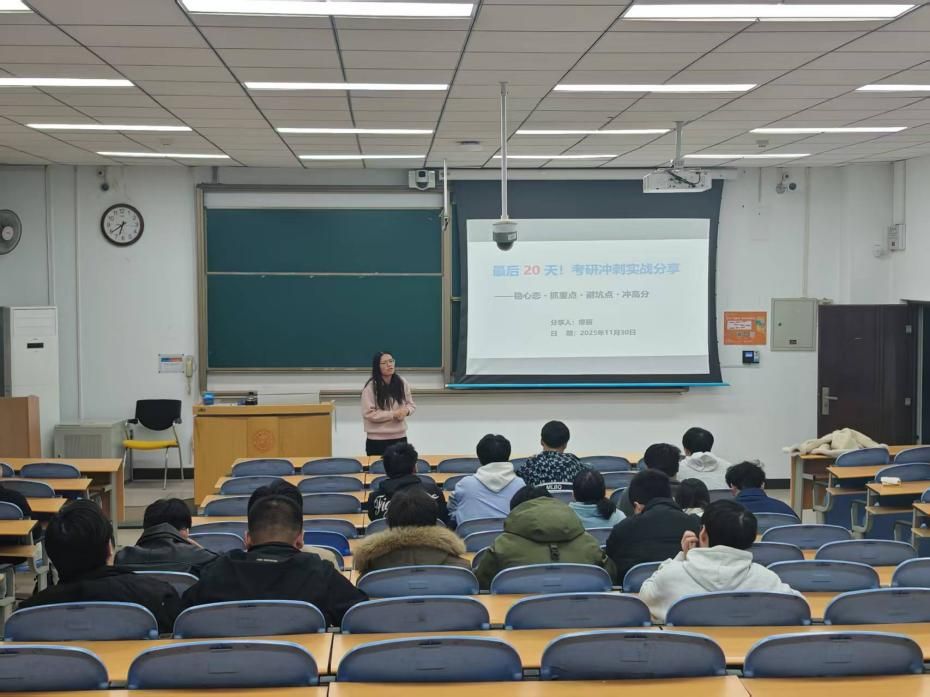 (通讯员 樊文荣)为帮助大四备考学子缓解心理压力、科学备考,11月30日晚,永利3044集团官网研究生学术辅导员组织开展考研冲刺经验分享会,学院研究生廖丽、向缘迪担任主讲人,围绕心态调适、复习规划、考场应对等内容展开分享,为备战学子注入信心与动力。