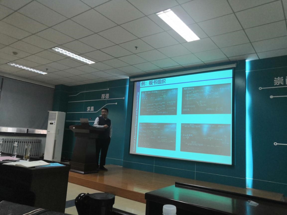 李培咸教授以省级精品课程《量子力学》的教学为例,探讨如何将思政教育巧妙渗透教学的全过程,润物无声,真正落实课程育人的实效。李老师提出,教师本身就是课程思政,认真的对待教学,就是课程思政的基础。教师对待课程的态度,会影响学生的学术性格,教师对外部世界各类问题的看法,会潜移默化的影响学生的世界观、人生观、价值观。针对青年教师,李老师说,针对不同的课程要充分借助不同的教学手段,没有一定之规。比如,《量子力学》课程板书效果最佳,容易让学生更直观感受公式,理解计算推导的过程;但是,像《线性代数》等,存在大量简单重复的行列式、矩阵等的表示,就最好借助PPT教学,以推进教学进度。