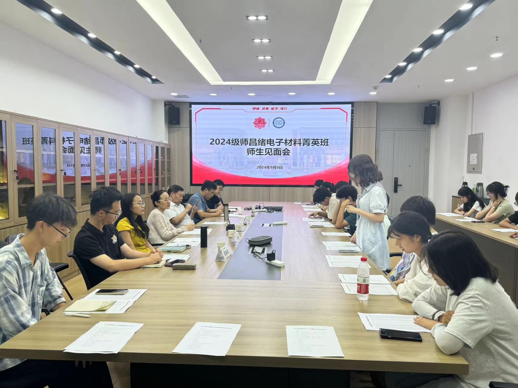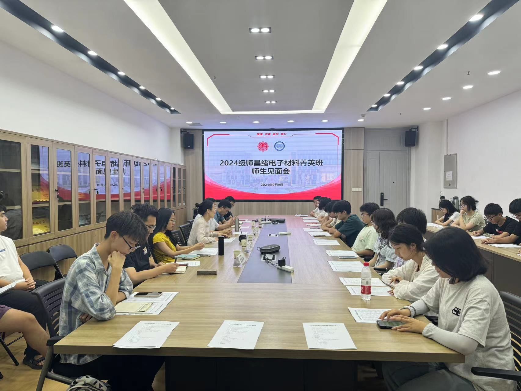 在科技飞速发展的时代,材料科学作为高新技术的基石,其重要性日益凸显。9 月 9 日下午14:00,2024级师昌绪电子材料菁英班(以下简称“师班”) 师生见面会在南校区教学楼G楼142会议室隆重召开, 国家教学名师周益春教授,学院党委书记宋刚锋、执行院长杨丽、党委副书记陈刚、24级“师班”副班主任刘炫伶,辅导员张闻功、师班全体新生以及领航队长共 40 余人齐聚一堂。会议由刘炫伶主持,现场气氛热烈而融洽。