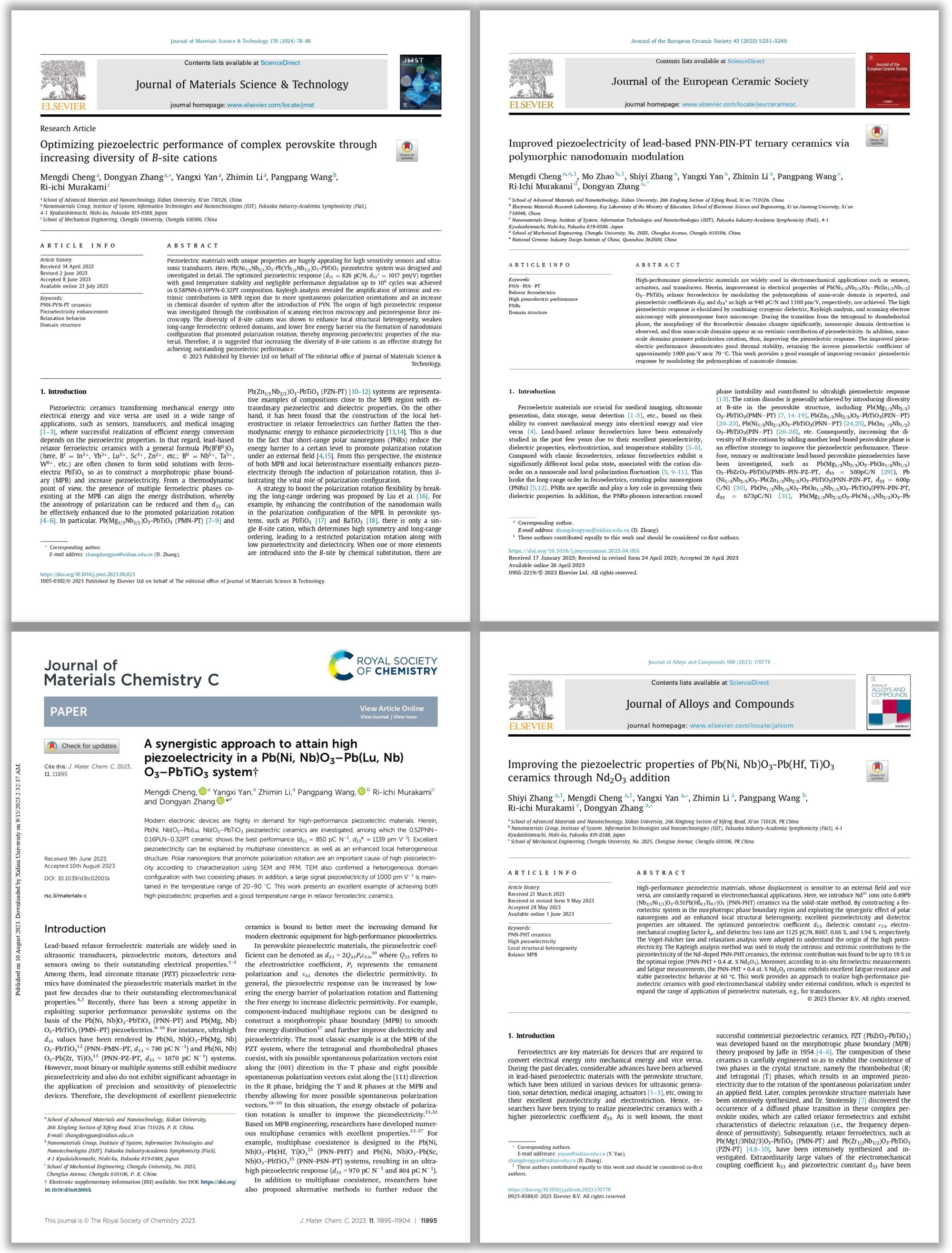 程梦迪在研发高性能弛豫铁电陶瓷的过程中,一直在思考压电材料微观结构与宏观性能之间的联系。她不但在白天加紧设计铅基陶瓷及测试相关性能,晚上还主动利用空余时间研究畴构型与局域异质结构对压电、介电性能的影响机制。功夫不负有心人,经过大量实验和理论分析,她逐渐探索到了设计高性能多元铁电陶瓷的突破点。研二期间,她一边做实验,一边着手撰写论文,并自主学习了PFM、Matlab、GSAS、Vesta和GMS等专业测试仪器和数据分析软件以支撑自己进一步的科研探索,最终取得了阶段性成果!在导师的指导下,她以第一/共一作者身份在国际知名期刊《Journal of Materials Science & Technology》《Journal of the European Ceramic Society》《Journal of Materials Chemistry C》和《Journal of Alloys and Compounds》上发表SCI论文4篇。她创新性地在二元压电体系中引入不同半径和价态的B位阳离子以增加系统的无序性,从局域尺度上降低极化的各向异性,设计了多种具有高机电性能的压电体系,为后续设计优异综合性能的电子陶瓷材料提供了参考。