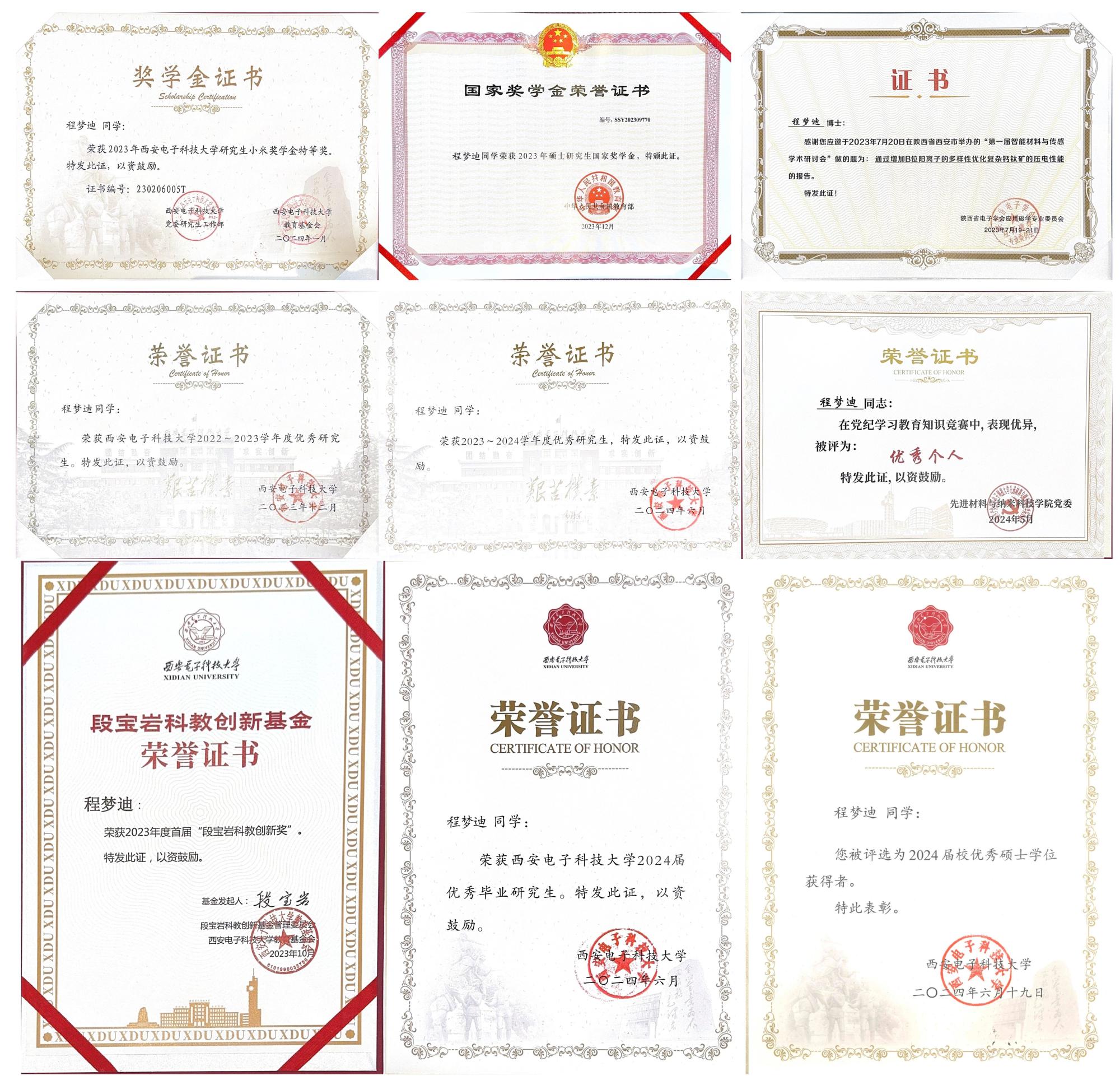 书山有路勤为径,学海无涯苦作舟。回顾三年的的科研生活,程梦迪刻苦钻研,勇于创新,通过系统的学习以及多途径拓宽专业领域知识,她取得了优异的成绩,在2022~2023年度总评中位居年级排名第一,并荣获“国家奖学金” “小米特等奖学金” “段宝岩科教创新奖”等荣誉奖项。